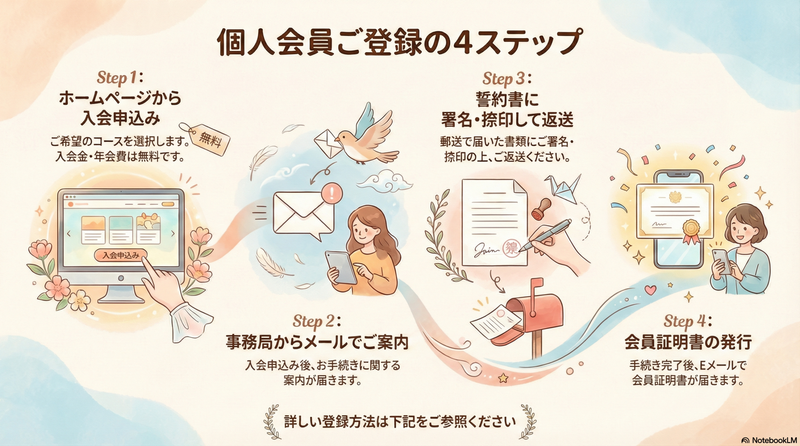 ※入会日は、入会申込みを受理した日の翌月1日となります。会員期間は入会日より1年間です。原則として自動更新となりますので、退会をご希望の方は事務局までご連絡ください。